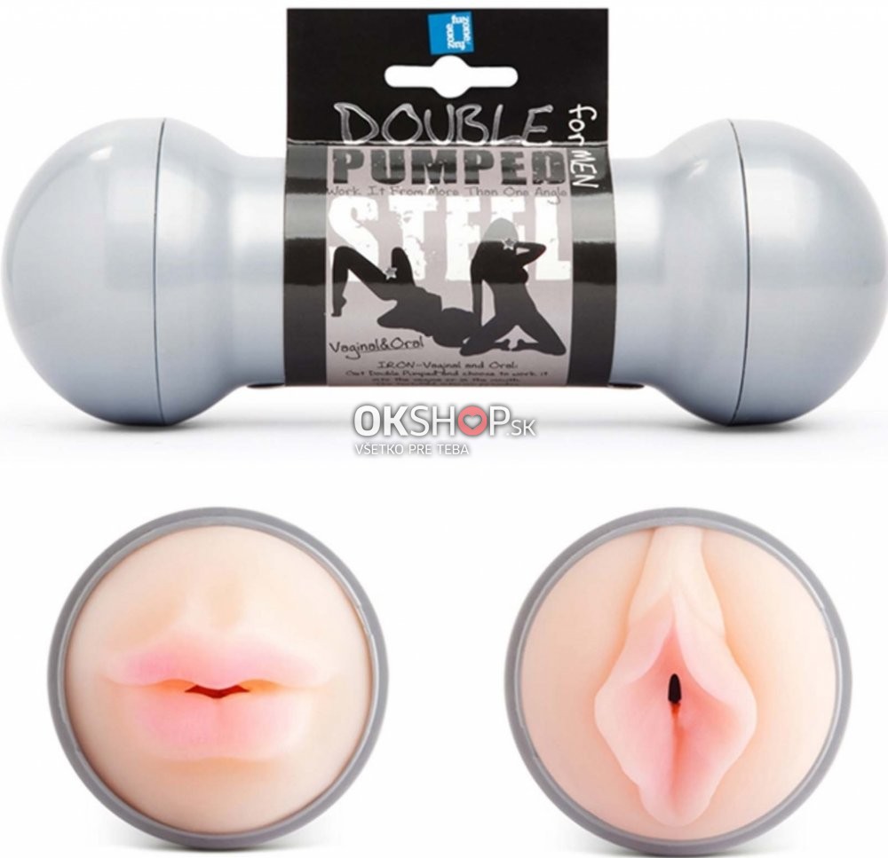Extra masturbátor 2 v1 Double Pumped Steel od značky FunZone prináša nový rozmer do skupiny masturbátorov pre mužov. Má tvar činky, kde na jednej strane je ukrytá vagína a na druhej ústa. Obe sú v realistickom telovom prevedení s flexibilným priemerom, ktorý sa ľahko prispôsobí vašej veľkosti. Vagína i ústa sú vyrobené z príjemne sametovo hebkého materiálu "LoveSkin", ktorý je k nerozoznaniu od ľudskej pokožky. Vo vnútri má materiál stimulačné hrbolčeky, ktoré budú dokonalo dráždiť váš penis po celej jeho dĺžke.