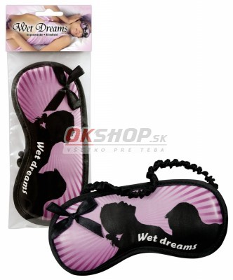 Nič nevidieť a všetko cítiť - Maska na oči z ružového a čierneho saténu, s nápisom Wet Dreams (vlhké sny), a s tieňom párika v erotickej polohe
