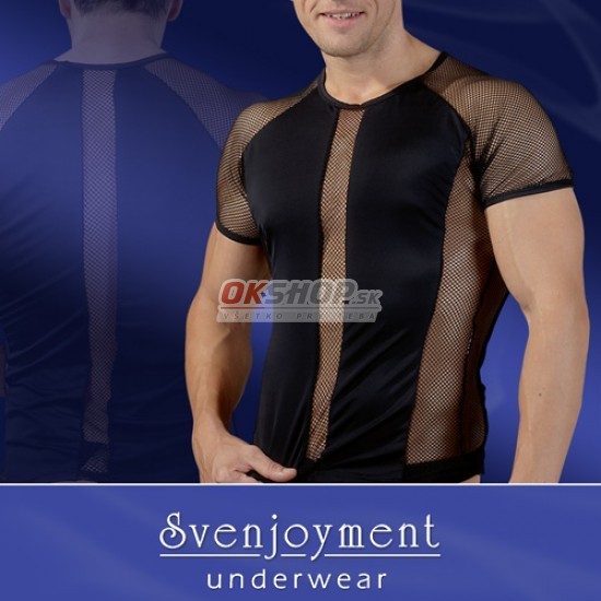 Pánske čierne elastické tričko s krátkym rukávom. Tričko je šité prekladane sieťovinou a elastickú látkou. Kombinácia sieťovaných priesvitných partií poodhalí boky, hruď aj chrbát.